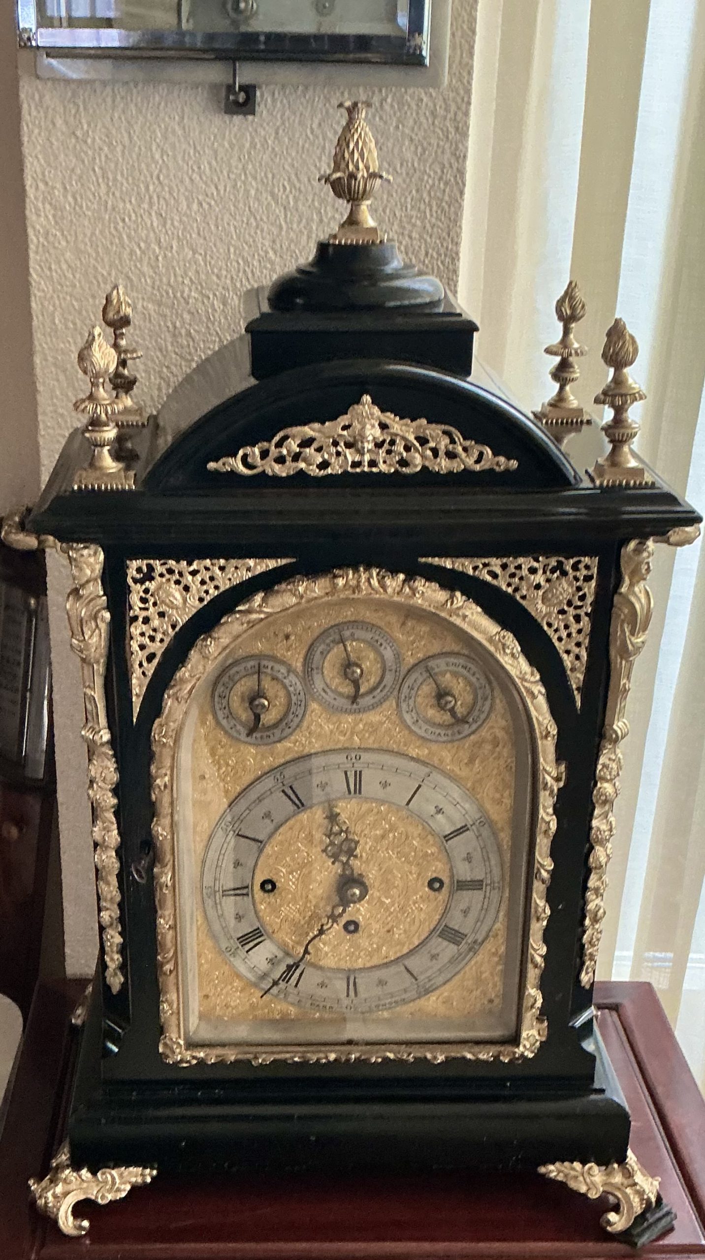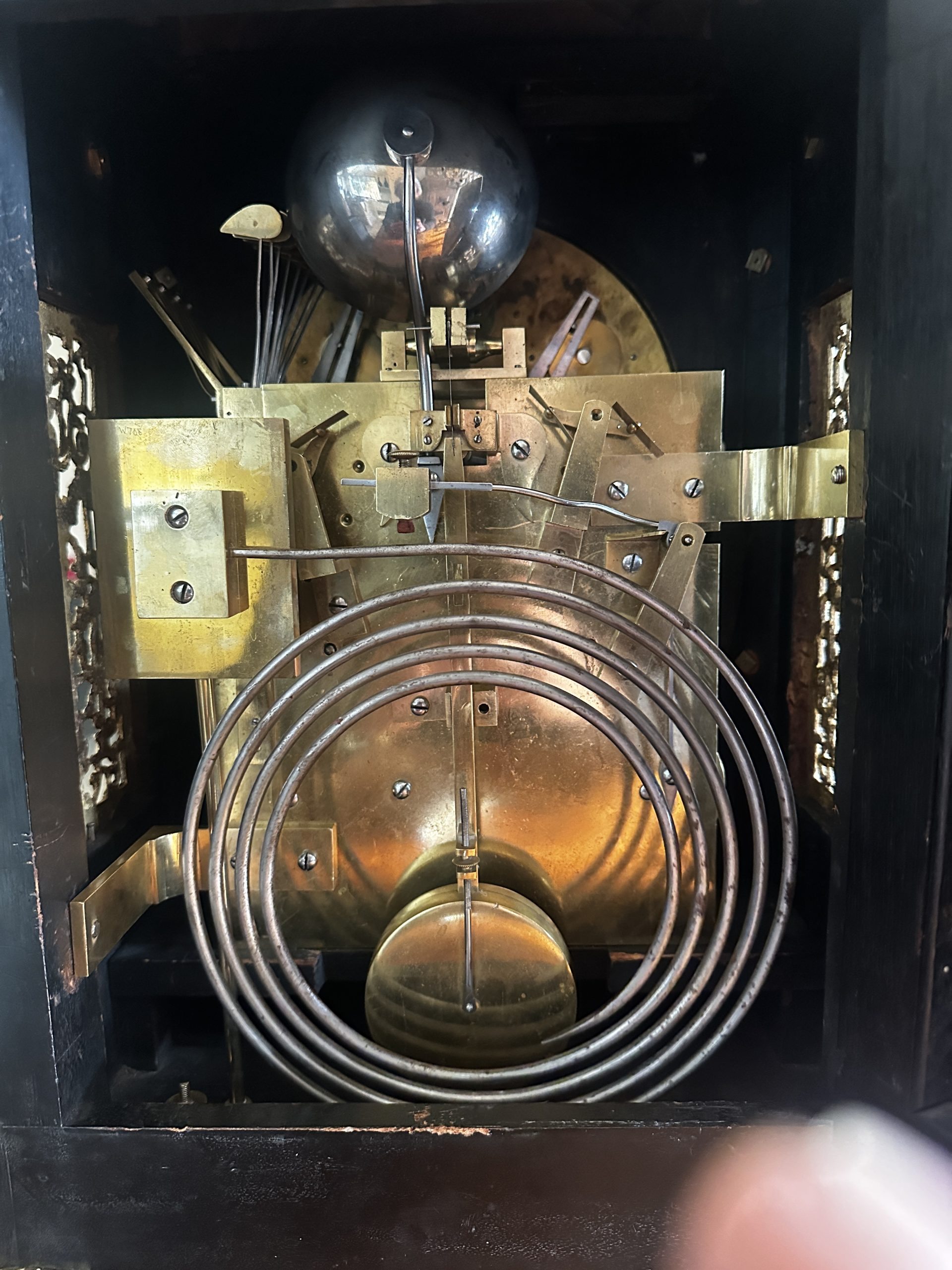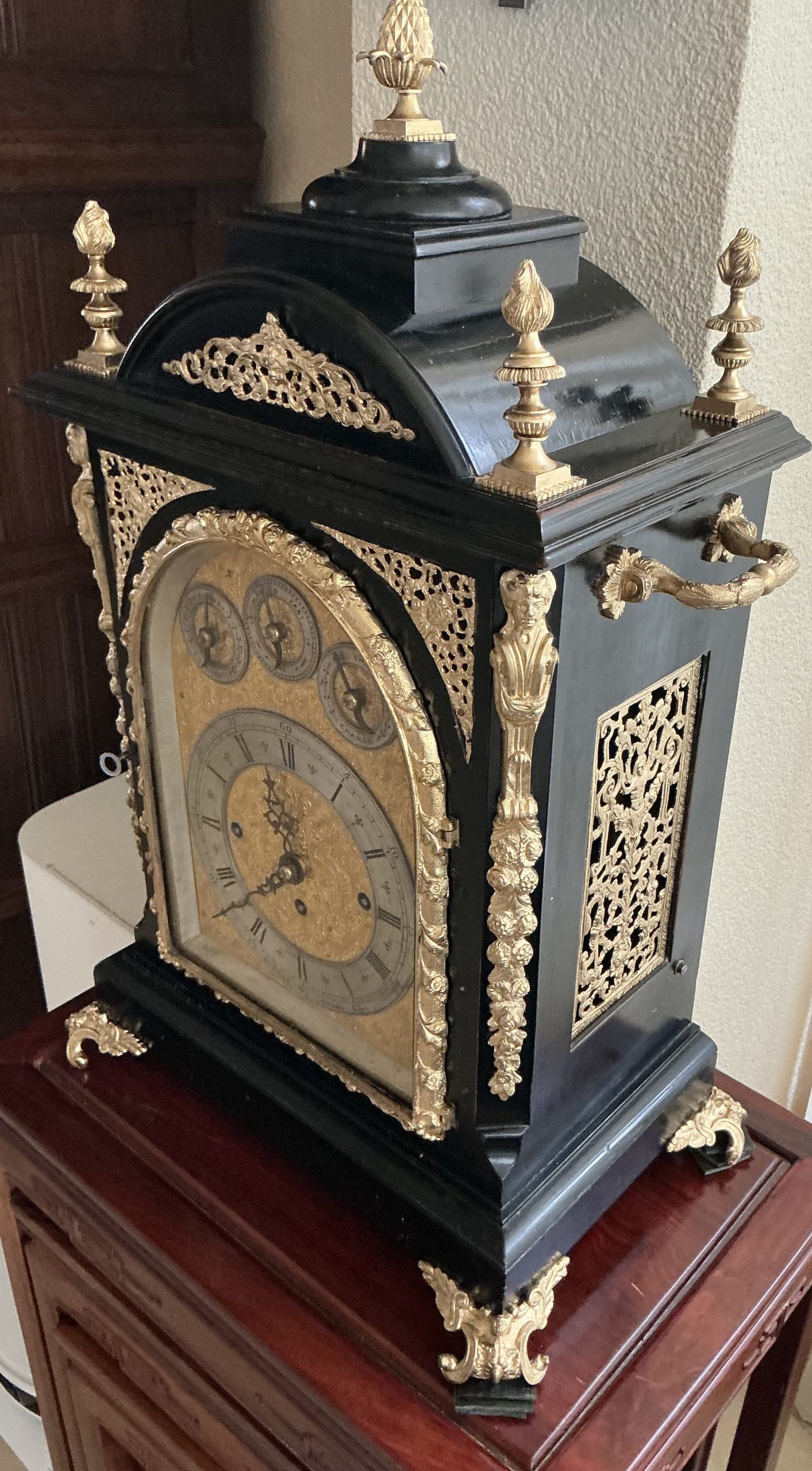 Zwart gepolitoerde Engelse bracket-tafelklok met 8 bellen en uurslag op gong.