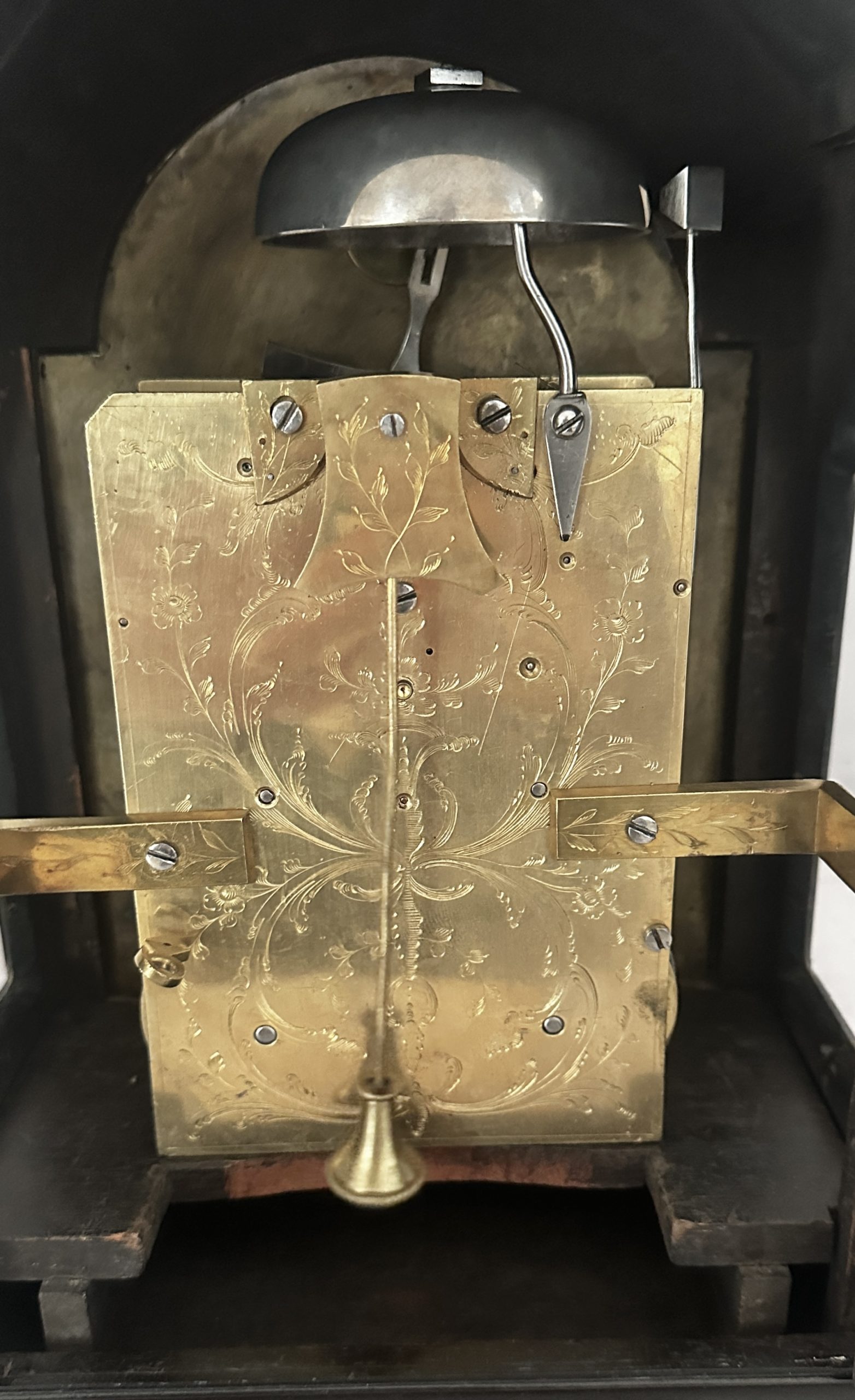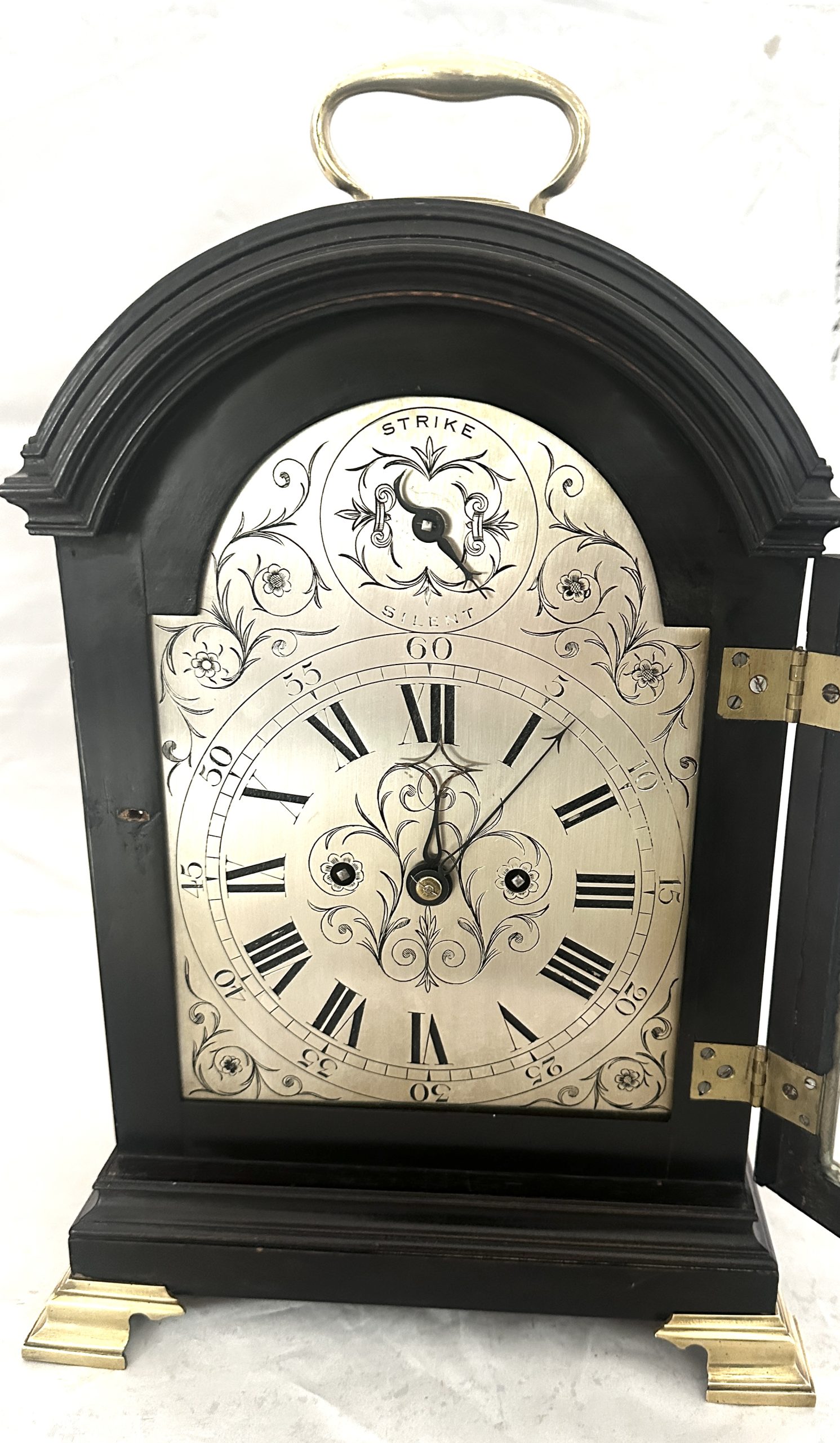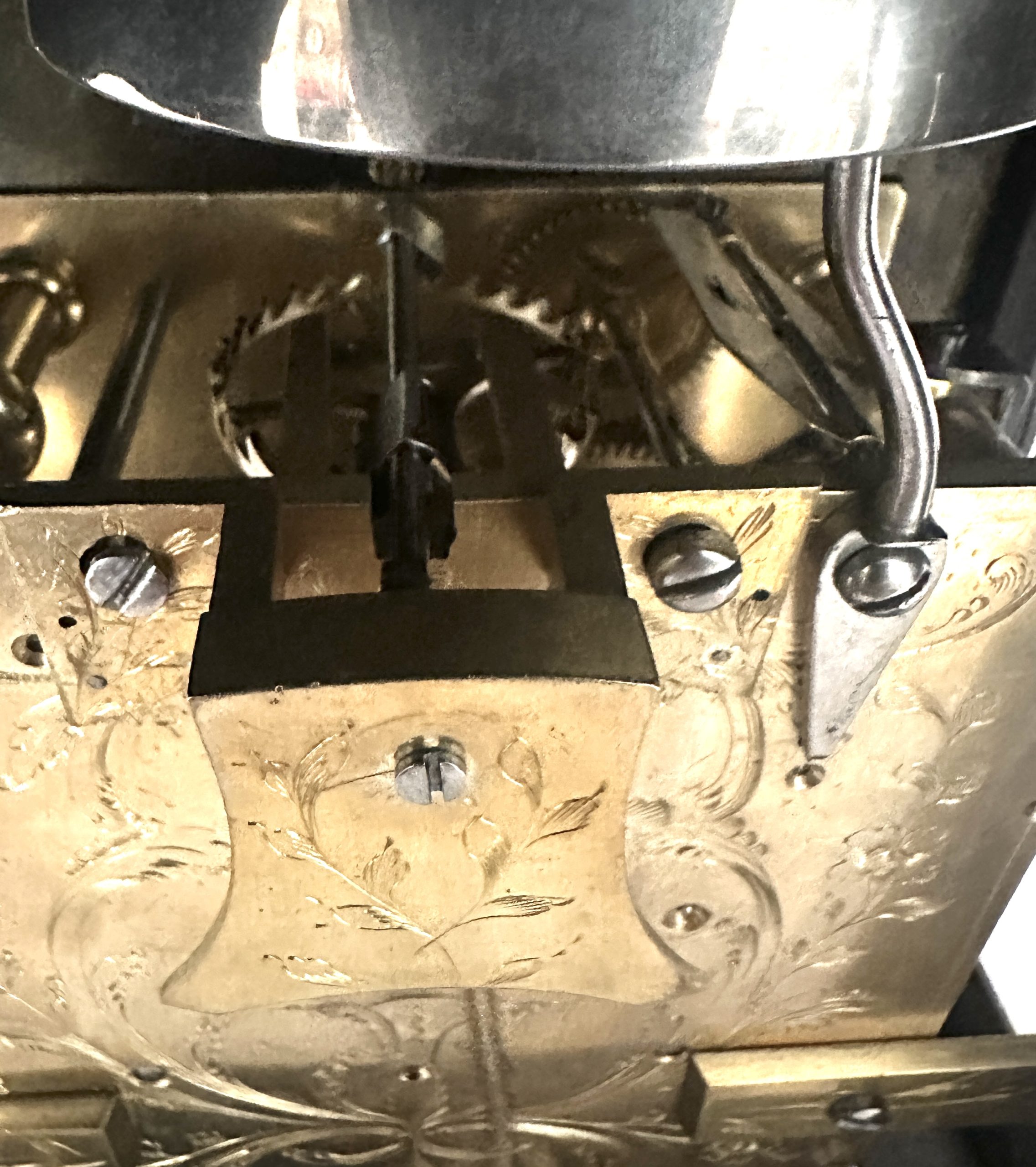 Verzilverde wijzerplaat met fraaie florale gravering.